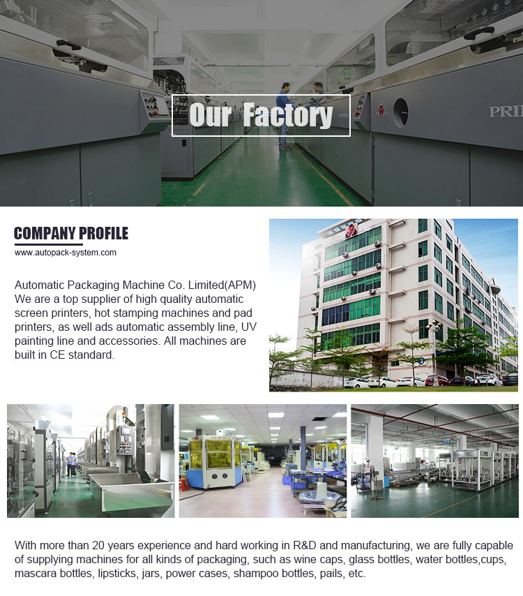 APM-S102C on täysin automaattinen pullokuppiseulatulostin, se voi tulostaa PP-, PE-, PET-muovikuppeja sekä muita materiaaleja, tarvitsee vain vaihtaa musteita. Tämä automaattinen näyttötulostin, jossa on automaattinen liekkikäsittely ja automaattinen UV-kuivaus tai LED-kuivaus, voi lisätä täysin automaattisen latauslaitteen ja purkupöydän, jotta tulostus on täysin automaattista.